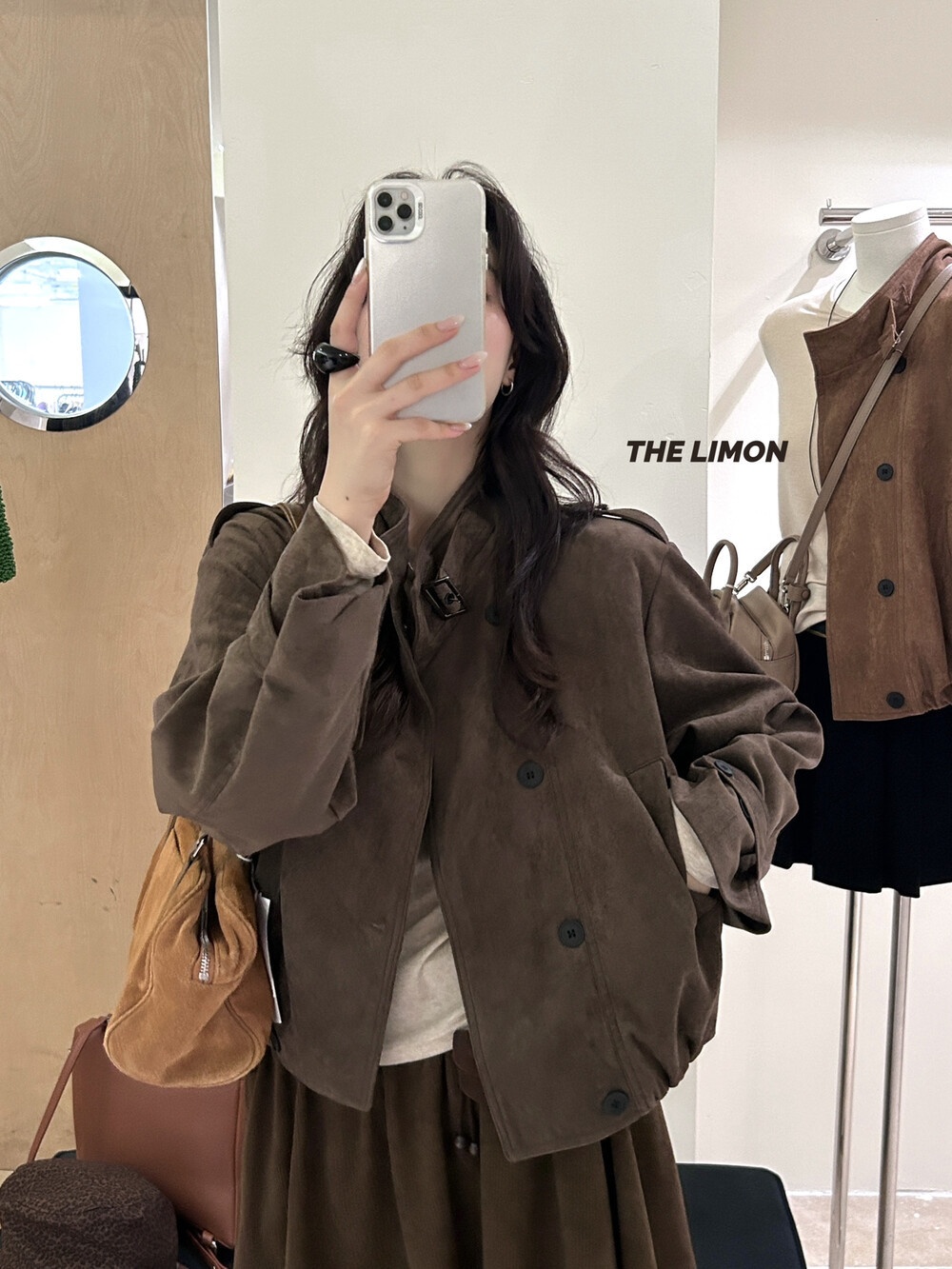 2025 Autumn Women's Clothing The Lemon Green Tea Retro Suede Jacket Coat For Women Stand Collar Short Top