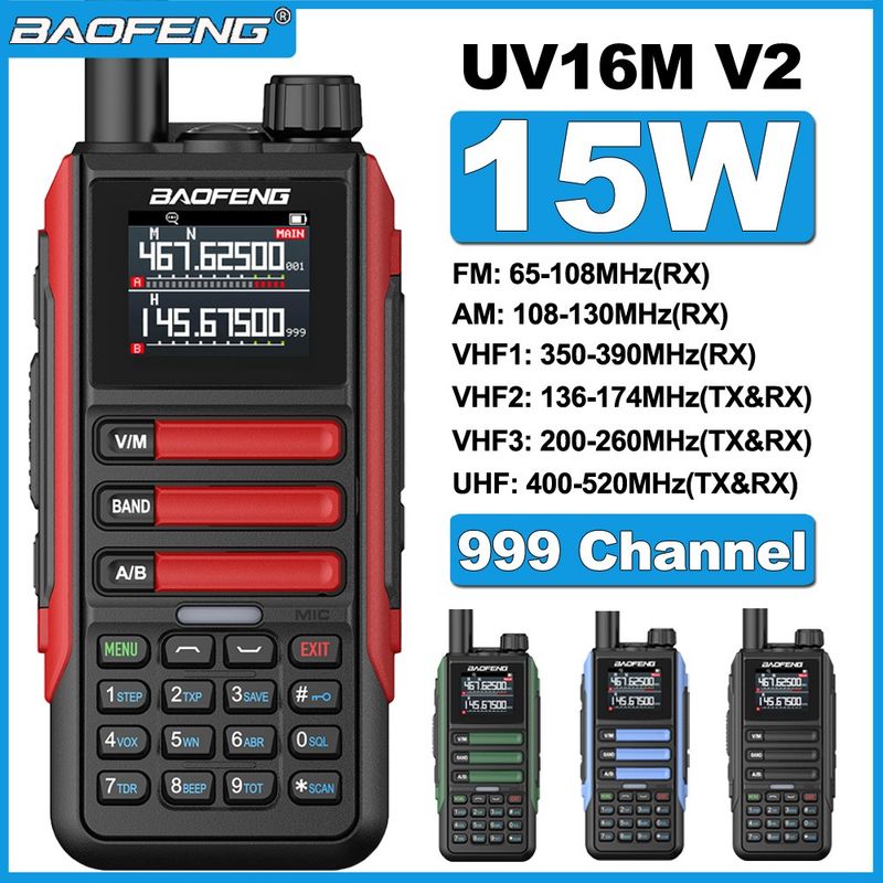 Baofeng Walkie-Talkie UV-16M V2 15W Long Range Portable 999 Channel Ham FM UHF VHF USB-C Charge Two-Way Waterproof