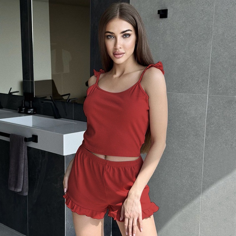 Product Category:Set,Fabric Name:Ribbed Textured Stripe,Design:Camisole,Main fabric composition:Polyester Fiber Dacron,Thickness:Average,Fabric Thickness and Weight:Thickness 201-250g/m²,Collar Style:Collarless,Sleeve Length:Sleeveless,The length of the pants:Shorts,Functionality:Casual, Nursing, Breathable, Sleep, Bathing, Stretchy, Fun, Home, Warm, Cool, Comfortable, Wearable Outdoors,Time to market:Autumn 2022,Suitable for the season:Summer, Winter, Spring, Autumn, All-season,Applicable to all categories of people:young women,Applicable Scenarios:Outdoor, Home, Hotel Bathhouse, Wedding Photo Studio,Color:02#Green, 03#Jujube Red, 04#Blue, 60002#Brown, 06#Purple,Size:M,L,XL,XXL,Brand:Zolifon,Origin:Puning,Item Number:60002#,Is it exclusively for cross-border export supply?:yes,Main fabric ingredient content:50% included - 70% excluded,Style:European and American Style,Content of the main fabric components:66% polyester, 28% rayon, 6% spandex,1:Women's Home Sleepwear,2:European and American Style Loungewear