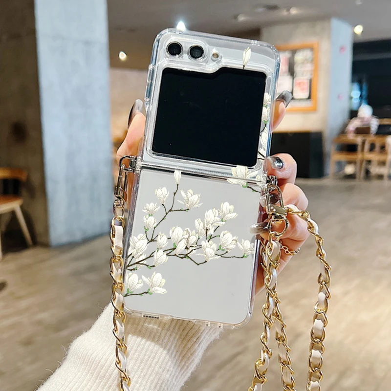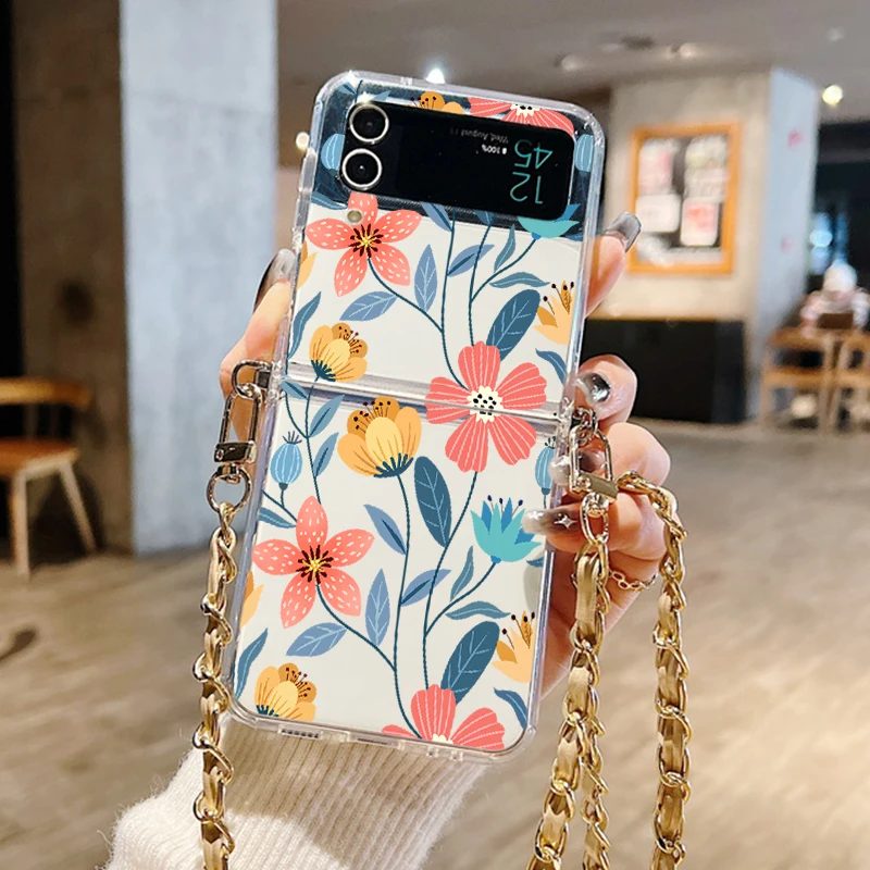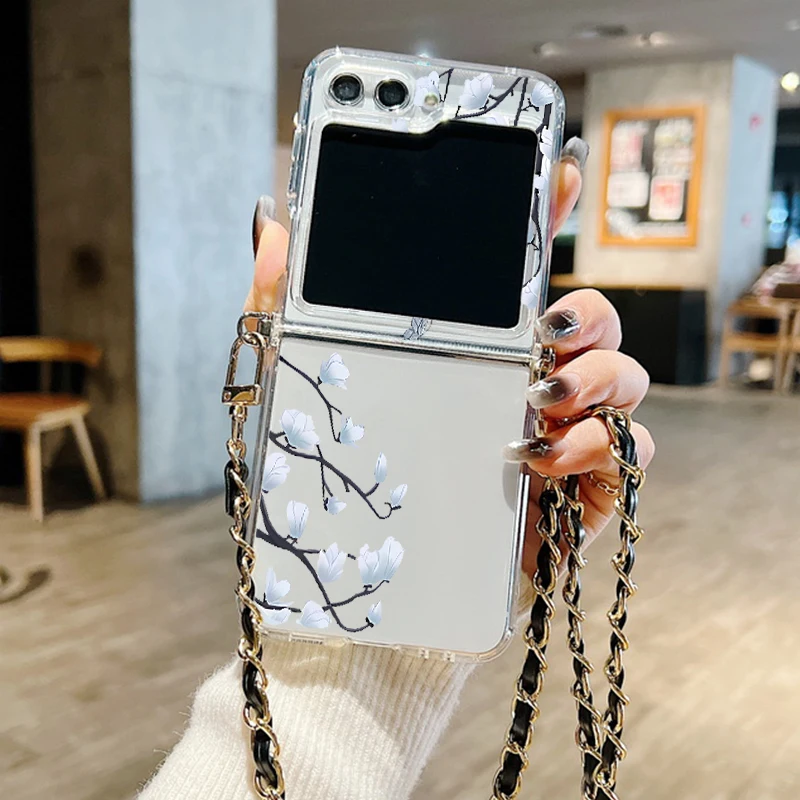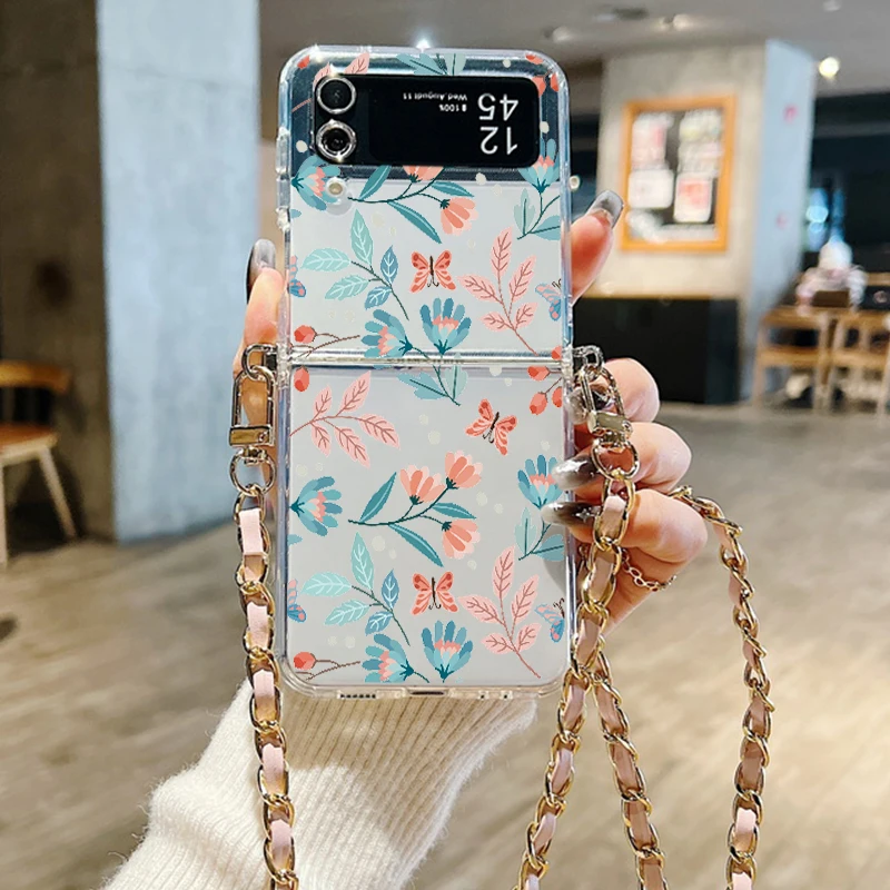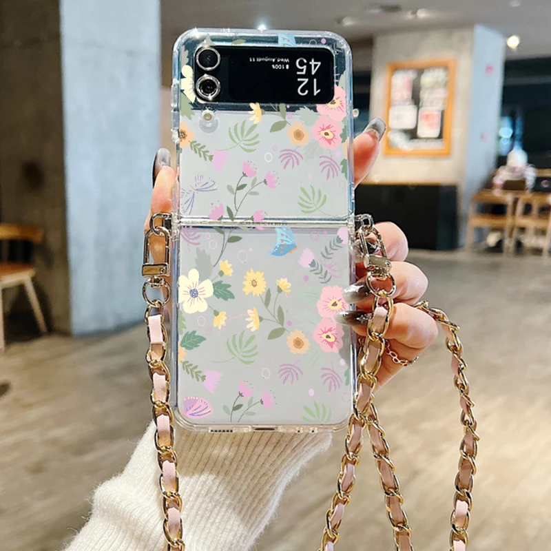 Silikonski ovitek s cvetličnim potiskom za Samsung Galaxy Z Flip 6 5 4 3 5G, zložljiv, z mehko kovinsko vrvico za Samsung Z Flip5.