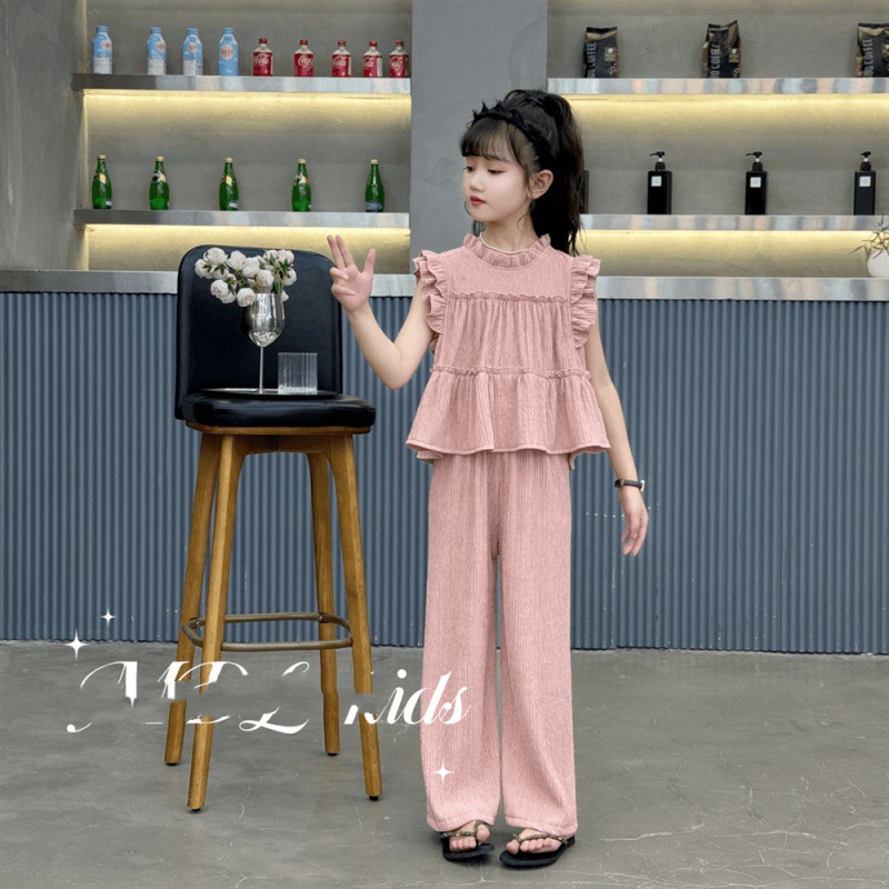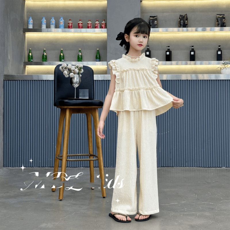 Children's and Girls' Summer Clothes Set 2024 New Mid to Large Children's Sleeveless Cake Top Wide Leg Pants Princess Style Two Piece Set