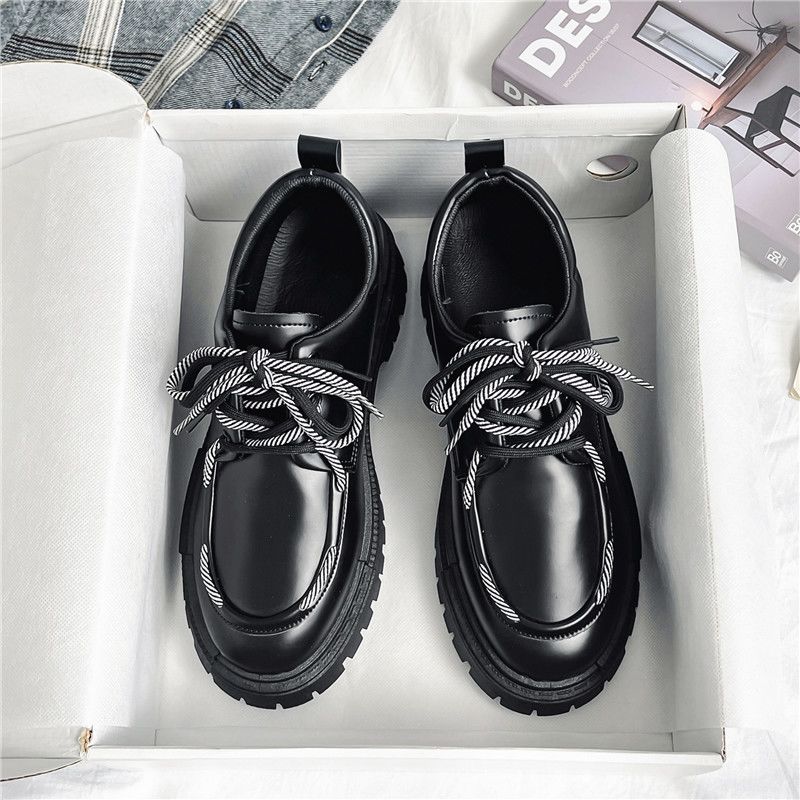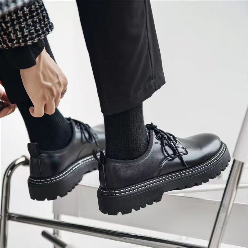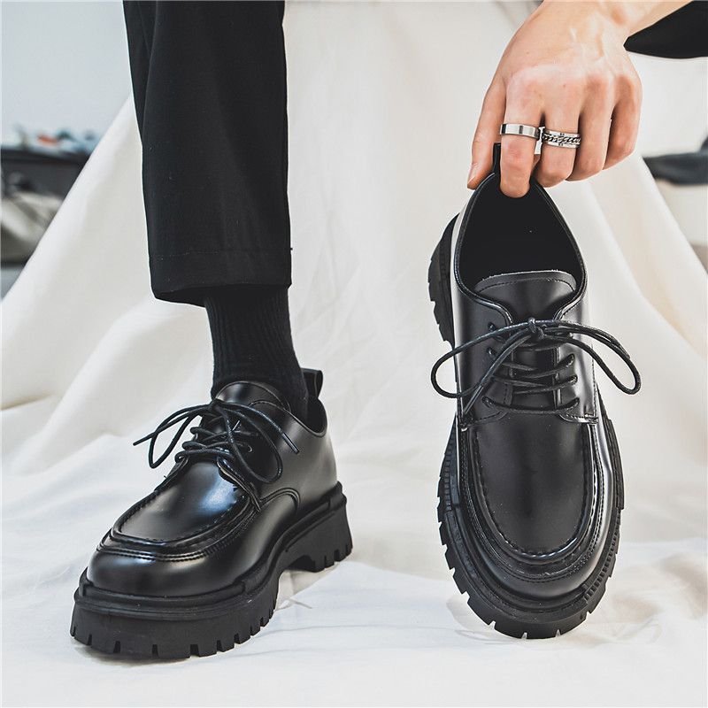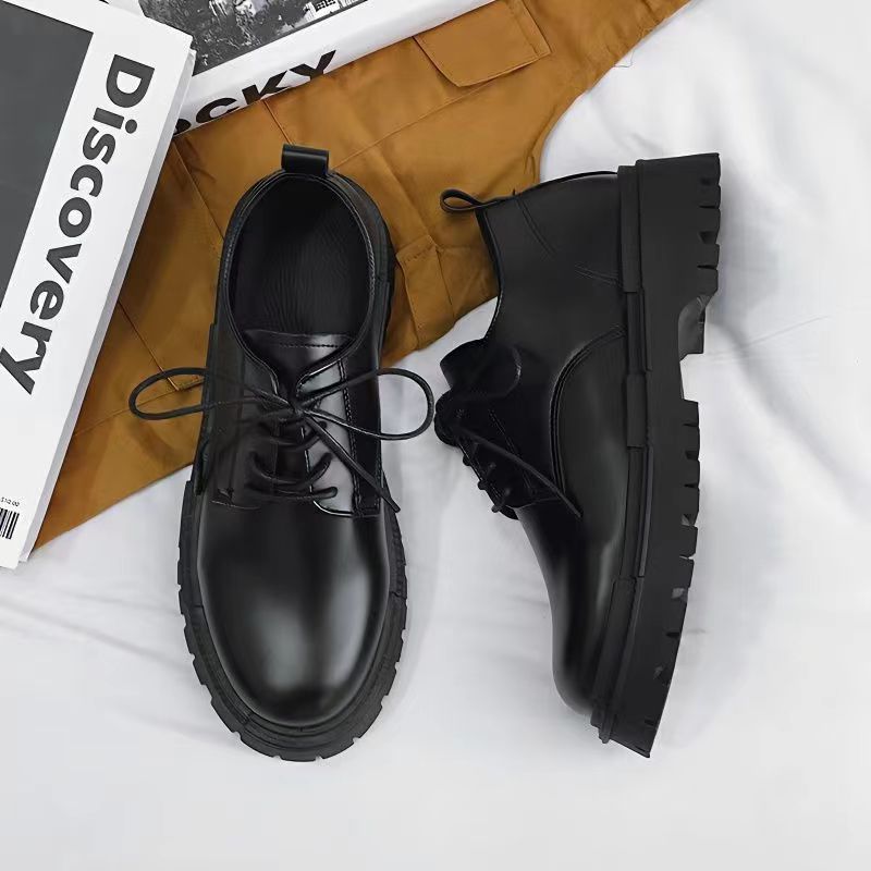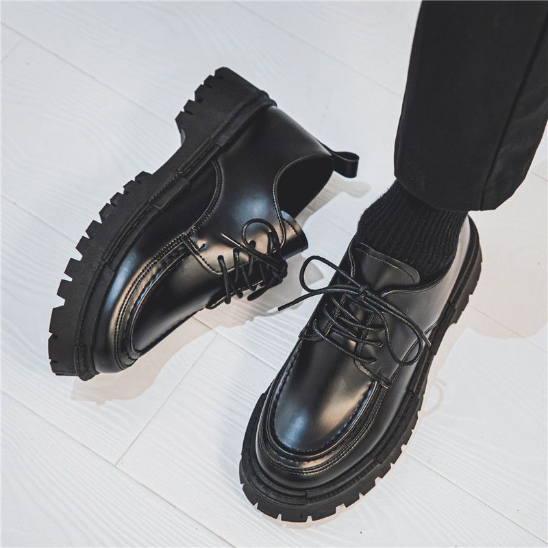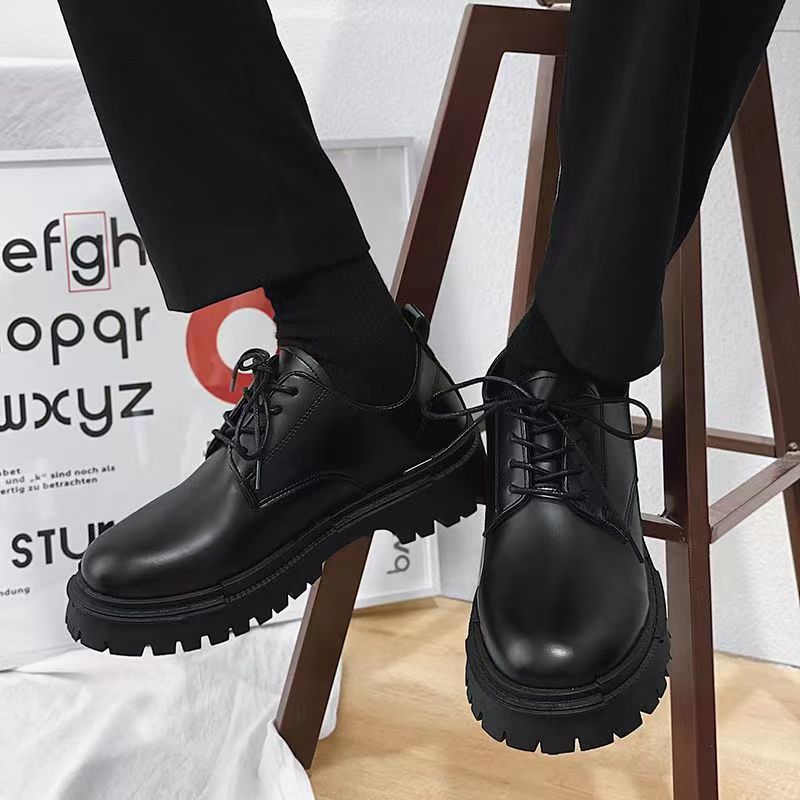 Leather shoes for men in spring and summer, new black round head with high inner height, student lace up small leather