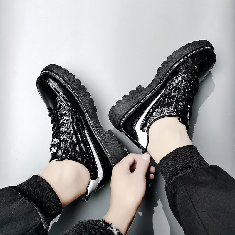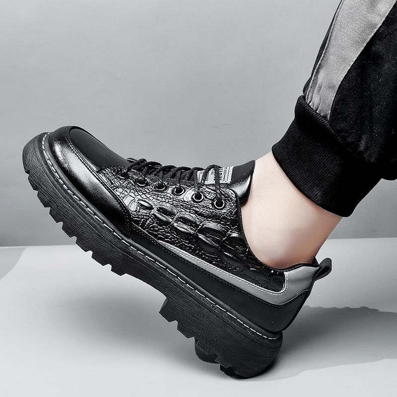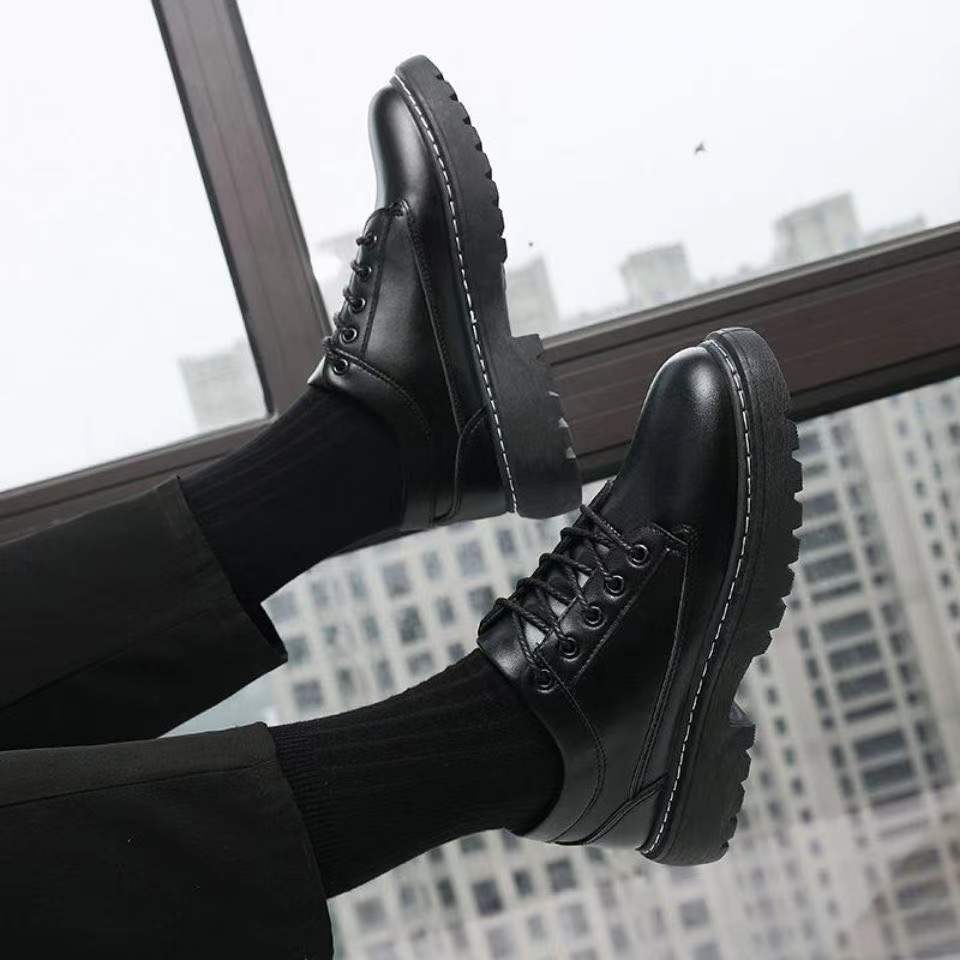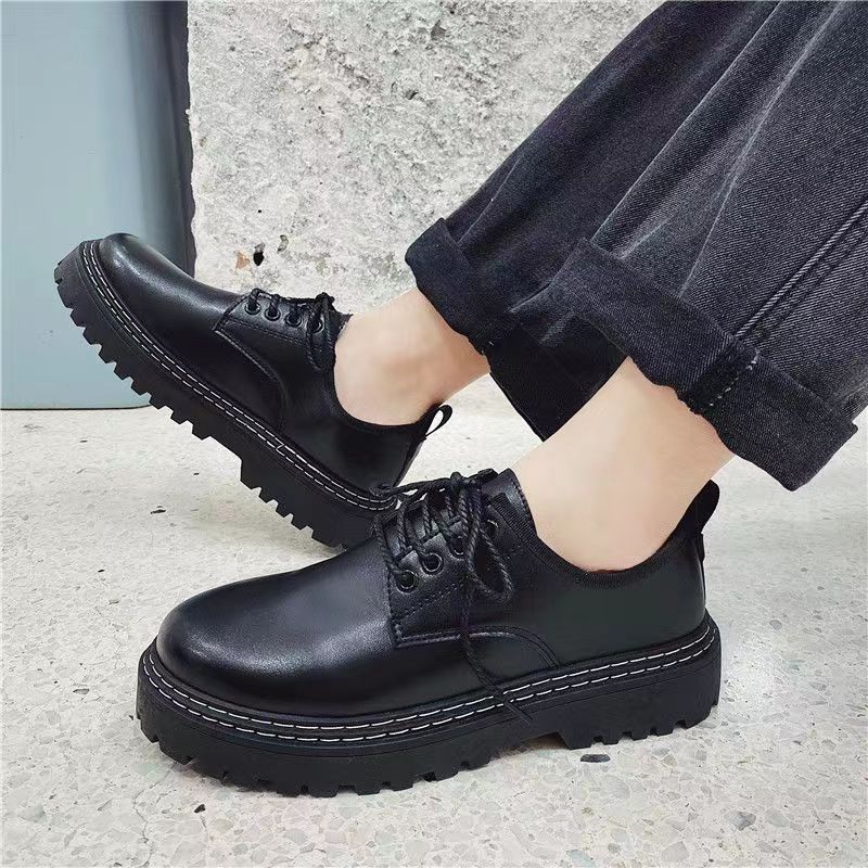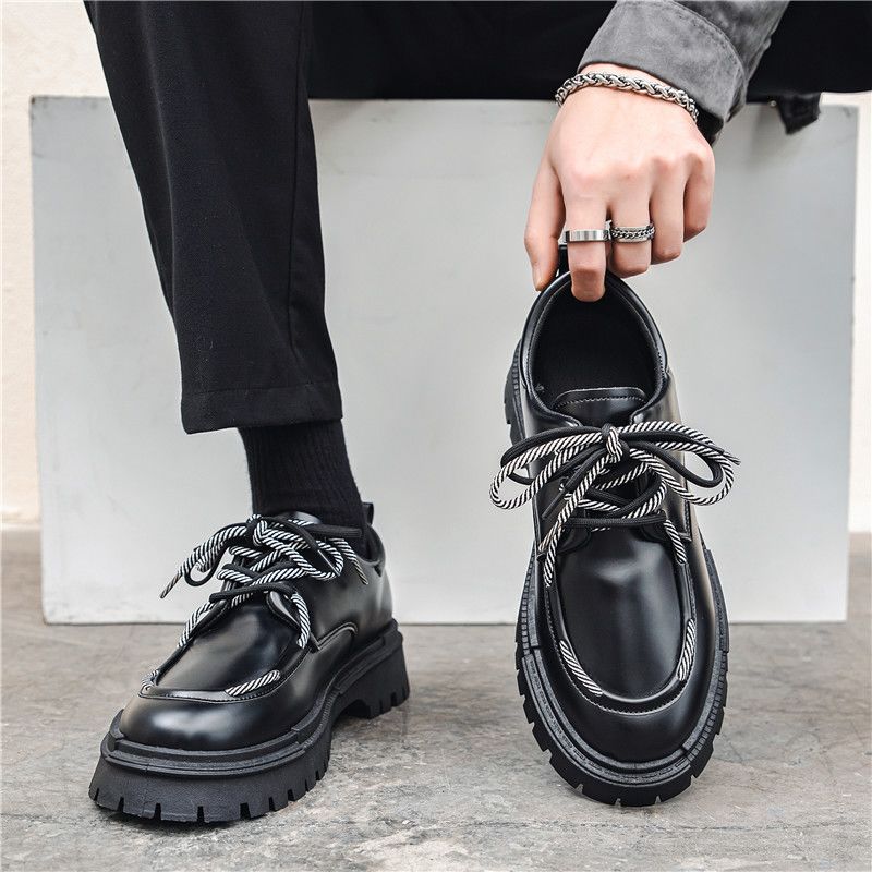 Leather shoes for men in spring and summer, new black round head with high inner height, student lace up small leather
