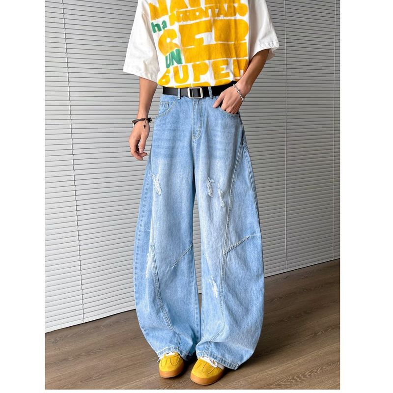 Washed and worn curved knife jeans for men, American hip-hop high street wide leg pants, loose straight leg pants