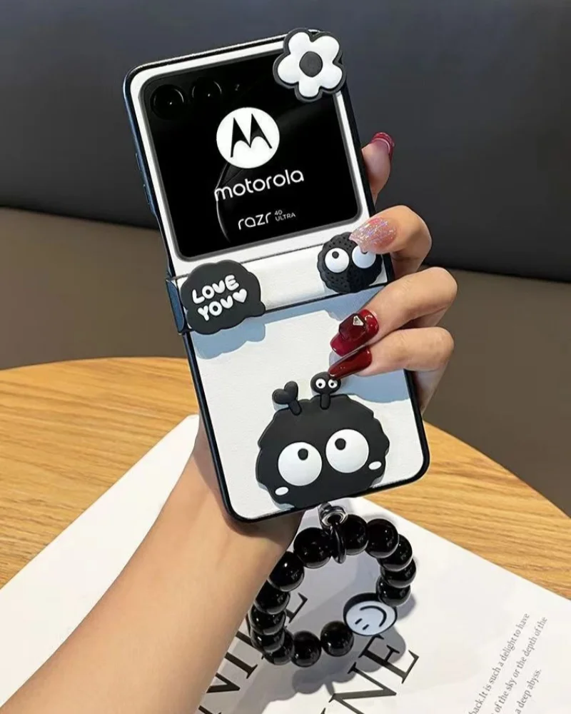 Ovitek za telefon Motorola Razr 40Ultra in moto Razr 50 Ultra 2024 z zapestnico in verižico v korejskem kawaii vzorcu cvetja in premogovih kroglic.