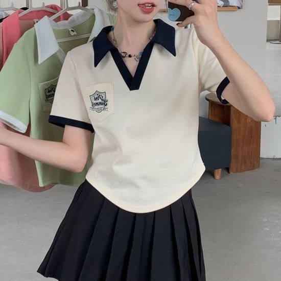 Shoulder polo collar contrasting short sleeved T-shirt for women in summer, loose design, niche and chic short top