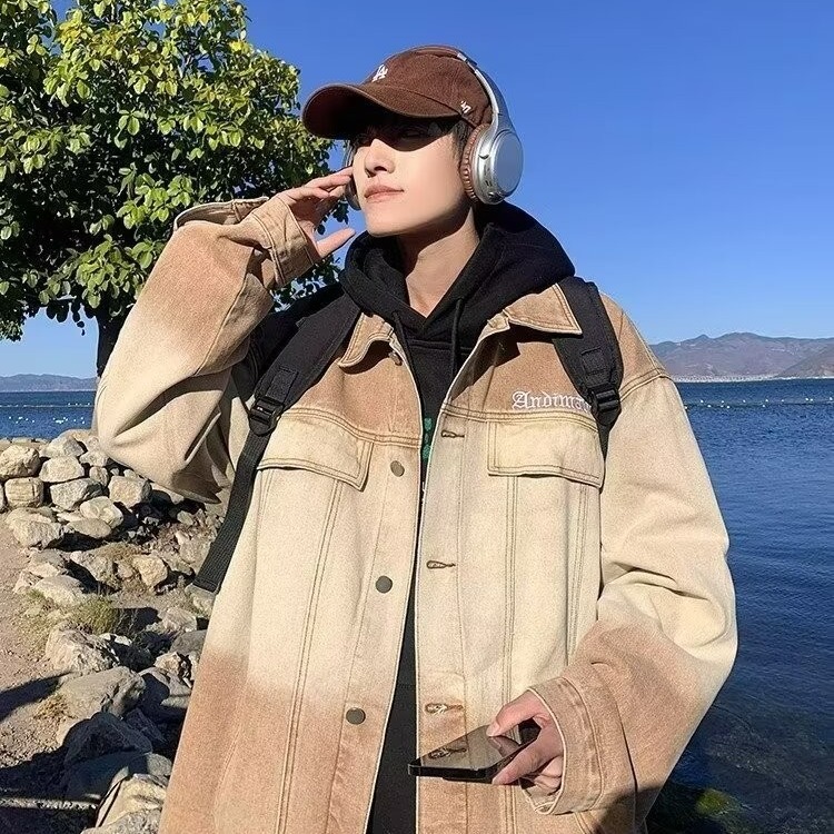 Spring and Autumn Collar Gradient Retro Color Cowboy Jacket Men's Casual Work Jacket