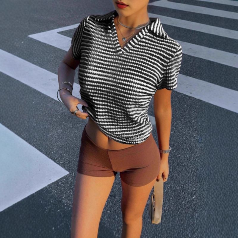 Women's Simple Striped T-Shirt Summer Comfortable Loose Polo Collar Deep V Knitted Top